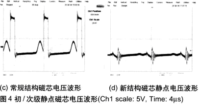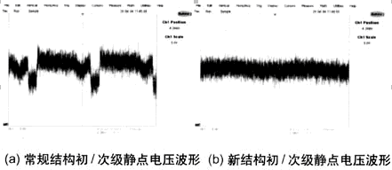 測(cè)量變壓器初級(jí)和次級(jí)靜點(diǎn)的電壓波形及變壓器磁芯的電壓波形,可以為EMI的傳導(dǎo)測(cè)試提供一些參考(見(jiàn)圖4)。常規(guī)結(jié)構(gòu)變壓器的初級(jí)和次級(jí)靜點(diǎn)電壓波形的幅值為10V,并且可以明顯地看到基于開(kāi)關(guān)頻率的開(kāi)關(guān)波形。新結(jié)構(gòu)變壓器的初級(jí)和次級(jí)靜點(diǎn)電壓波形的幅值為5V,基于開(kāi)關(guān)頻率的開(kāi)關(guān)波形不是很明顯。常規(guī)結(jié)構(gòu)的變壓器的磁芯電壓波形的幅值為18V,可以明顯地看到基于開(kāi)關(guān)頻率的開(kāi)關(guān)波形。新結(jié)構(gòu)的變壓器的磁芯電壓波形的幅值為5V,基于開(kāi)關(guān)頻率的開(kāi)關(guān)波形不是很明顯。