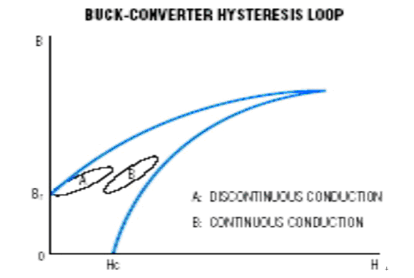 磁芯損耗主要是由于磁滯現(xiàn)象以及磁芯內(nèi)部傳導(dǎo)率或其他非線性參數(shù)的互感產(chǎn)生。在Buck拓撲結(jié)構(gòu)中,第一象限的B-H磁滯回線對磁芯損耗影響最大。在第一象限這個局部圖中,磁滯回線顯示了電感從初始電感量過渡到峰值電感量再回到初始電感量的過程。如果開關(guān)電源穩(wěn)定工作在不連續(xù)狀態(tài),磁滯回線會從剩余電感量(Br)過渡到峰值電感量(參考圖1)。如果開關(guān)電源工作在連續(xù)狀態(tài),那么磁滯回線將會從直流偏置點上升到曲線峰值,再回到直流偏置點。通過實驗可以確定磁滯回線的精確曲線形狀(基本上是橢圓曲線)。