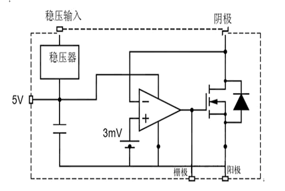 與同步整流器一樣,功率MOSFET工作在第三象限。比較器檢測(cè)MOSFET上的電壓,當(dāng)體二極管正向偏置時(shí),比較器導(dǎo)通MOSFET。這部分電路面對(duì)的挑戰(zhàn)是讓比較器隨著小的過(guò)載信號(hào)快速開關(guān),并且以大驅(qū)動(dòng)電流快速開關(guān)MOSFET。