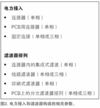 在電力接入和濾波器構造這兩方面之間(圖2),關于濾波器的構造方式(例如與內置濾波器的固定連接、帶有集成式線路濾波器的電力進入模塊、PCB上與分立濾波器的固定連接等),大約有10個有意義的組合。