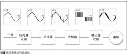 對于電力電子產品,特別是在驅動器領域,除了線路濾波以外,其它保護因素也會起到作用。圖3所示為某驅動系統(tǒng)的一種構造方式,不同的抑制元件在其中共同產生作用(定性的電壓特性)。