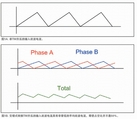 為了生產(chǎn)的更薄、高效而廉價的電源,近來開發(fā)了UCC28060,在單一設(shè)備中采用兩個交錯式轉(zhuǎn)換通道TM PFC的集成電路。UCC28060充分發(fā)揮了TM的全部優(yōu)勢,并利用交錯式轉(zhuǎn)換的優(yōu)勢來彌補(bǔ)TM的缺點(diǎn)。例如,如圖1A與1B所示,交錯式轉(zhuǎn)換降低了輸入紋波電流,所以可以使用小得多的EMI濾波器。交錯式轉(zhuǎn)換還降低了輸出波紋,可使用較小的輸出電容,并能延長電容壽命。交錯式轉(zhuǎn)換還可將一個大電感分成兩個較小的電感,提高了功率級別并實(shí)現(xiàn)了超薄的封裝。