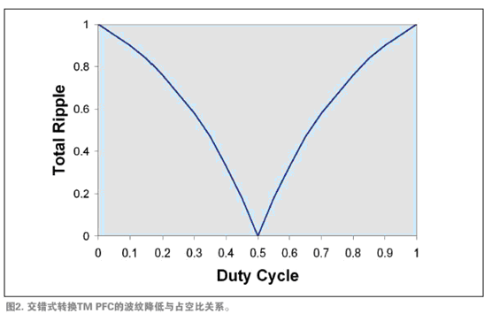 如果交錯式轉(zhuǎn)換電源轉(zhuǎn)換器以50%的占空比工作,第一相的輸入波紋完全抑制了第二相的輸入波紋,從而產(chǎn)生無開關(guān)成分的輸入電流,且不會產(chǎn)生EMI。在占空比偏離50%時,抑制作用降低,殘余波紋增大(參見圖2)。然而,波紋抑制多數(shù)的優(yōu)點(diǎn)還是實(shí)現(xiàn)了。