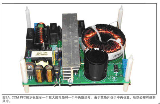 圖3A與3B顯示了兩個原型電源。圖3A是一個有正向轉(zhuǎn)換器進(jìn)行輸出穩(wěn)壓的單相CCM PFC及一個EMI濾波器。在此電源中,電感、大型濾波電容及散熱片體積均較大,位于中央位置,使電源體積略為龐大。圖3B是一個兩相交錯式轉(zhuǎn)換TM PFC。交錯式轉(zhuǎn)換電源非常薄,因?yàn)殡姼畜w積縮小了,輸出濾波器電容尺寸及布局均為散熱而考慮。如果布局采用同樣的規(guī)則,交錯式轉(zhuǎn)換TM PFC也可以縮小體積。