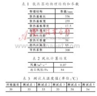軟件計算結(jié)果:表1為散熱器的物理結(jié)構(gòu)和參數(shù);表2為風(fēng)機(jī)的風(fēng)量和風(fēng)壓計算結(jié)果;表3為散熱器上選擇的五個測試點(diǎn)的溫度值。
