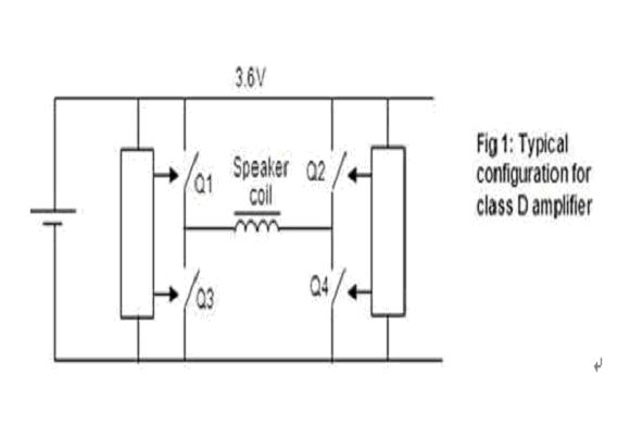 目前的移動(dòng)電話通常使用D類音頻放大器。這些放大器在一個(gè)H橋電路中采用了兩對FET來控制揚(yáng)聲器線圈。配置如圖1所示。Q1&Q4導(dǎo)通和Q2&Q3關(guān)斷時(shí)向一個(gè)方向驅(qū)動(dòng)揚(yáng)聲器線圈,Q1&Q4關(guān)斷和Q2&Q3導(dǎo)通