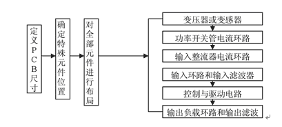 敏感線路主要是指控制電路和直接與干擾測量設(shè)備相連的線路。要降低干擾水平,最簡單的方法就是增大干擾源與敏感線路的間距。但由于受電源尺寸的限制,單純的增大間距并非解決問題的最佳途徑,更為合理的方法是根據(jù)干擾電場的分布情況將敏感線路放在干擾較弱的地方。PCB抗干擾布局設(shè)計流程如圖6所示。