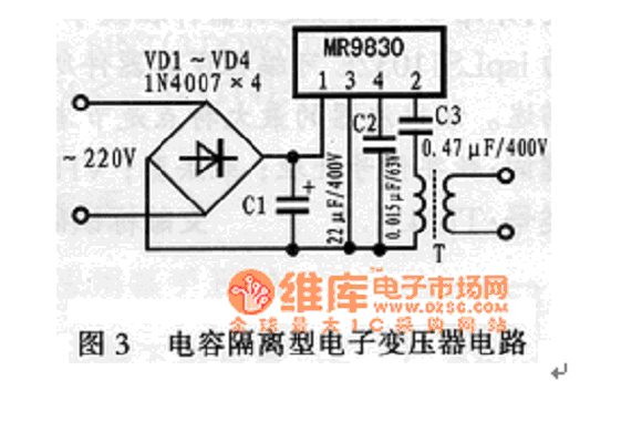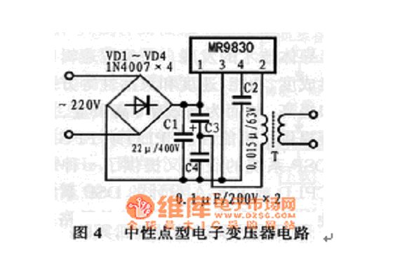 圖3和圖4是兩種不同接法的電子變壓器電路,其原理都是將MR9830的2腳輸出的高頻電壓由鐵氧體變壓器T降壓和隔離后輸出。其中,圖3是將MR9830的2腳輸出由C3隔離后得到電源負端形成回路。圖4則是利用C3、C4制造一個人為的“中性點”,而讓MR9830的2腳輸出的高頻電壓經(jīng)T的初級繞組到此“中性點”形成回路。經(jīng)實際測試發(fā)現(xiàn):圖3輸出的電壓