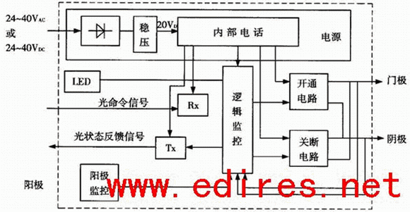 光控接口采用在工業(yè)生產(chǎn)中廣泛使用的標(biāo)準(zhǔn)元器件,它由Agilent技術(shù)生產(chǎn)的HFBR系列,推薦的標(biāo)準(zhǔn)型號光纖是1mm POF(塑料光纖) ,既經(jīng)濟(jì)又便于使用。對于超過15m的長距離推薦使用200μm的HCS光纖(硬包層石英光纖) 。光接收器:Agilent HFBR22528型,光輸入功率Poncs>- 21dBm(1 mm POF) , 光噪聲功率Poffcs <- 40dBm,光脈沖寬度門檻tGLITCH≤400ns ,對寬度≤400ns的光信號沒有響應(yīng)。