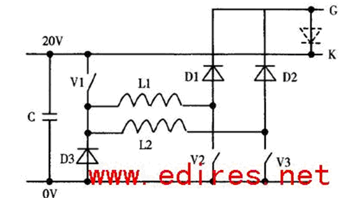 硬驅(qū)動關(guān)斷如圖4所示電路,當(dāng)將V6 開通時,電容C 對門極反向放電,將IGCT關(guān)斷。由于電路的極低電感(5 到15nH 取決于IGCT 的型號)和大電容器組,IGCT對門2陰極端的電磁噪音不敏感。與IGCT相比較,傳統(tǒng)的GTO驅(qū)動裝置大約有200 nH的電感和更小的電容器組。