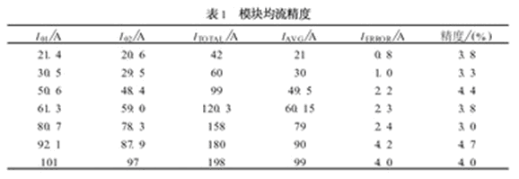 用兩個電源模塊作并聯(lián)實驗, 實驗數(shù)據(jù)見表1所列。由表1知, 它的負載均流精度(負載不平衡度)控制在5%以內。