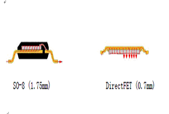 傳統(tǒng)的MOSFET使用引線(xiàn)鍵合來(lái)實(shí)現(xiàn)硅片和管腳框架之間的電連接,而DirectFET,將接觸面的數(shù)目和傳導(dǎo)路徑的長(zhǎng)度減到最小從而減小了傳導(dǎo)損耗。