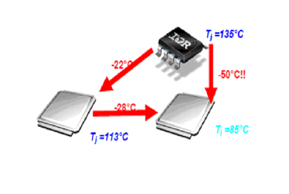 由于DirectFET的結(jié)殼熱阻低,所以用導(dǎo)熱墊將熱量從器件傳遞到系統(tǒng)底盤(pán)的做法很有效。這種結(jié)構(gòu),大量的熱從器件的頂部被帶走,DirectFET器件就可以布置在線(xiàn)路板上一個(gè)較小的區(qū)域內(nèi)。