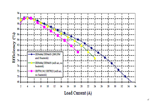 在一個(gè)12V輸入,1.3V輸出,工作頻率300kHZ的同步降壓變換器中,我們將IRF6603/IRF6604和IRF7822/IRF7811W這兩對(duì)管子做以比較,它們使用的硅片技術(shù)是相同的。負(fù)載電流增加時(shí),此變換器電路板的溫度不得超過(guò)105°C。當(dāng)電流達(dá)到18A時(shí),這是SO8封裝在無(wú)冷卻氣流的條件下能夠承受的大電流,IRF6603的結(jié)溫要低50°C。比較DirectFET和SO-8在靜止空氣無(wú)散熱器條件下的效率曲線(xiàn),在18A時(shí)前者的效率要高出3%。