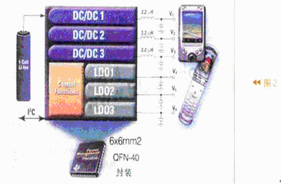 圖2是TI公司的一種電源管理IC(TPS65021)的功能結(jié)構(gòu)示意圖。它由1節(jié)鋰離子電池供電,由微處理器通過(guò)I2C與器件接口。TPS65021內(nèi)部有控制功能電路及6個(gè)電源(3個(gè)DC/DC轉(zhuǎn)換器,3個(gè)線性穩(wěn)壓器LDO,輸出V1-V6電壓)。它可以給手機(jī)供電及實(shí)現(xiàn)負(fù)載管理。