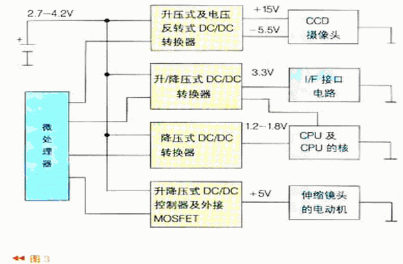 數(shù)碼相機(jī)中有三種電源:系統(tǒng)電源、LCD電源以及白光LED驅(qū)動(dòng)電源(背光照明及閃光燈電源)。系統(tǒng)電源部分由4個(gè)DC/DC轉(zhuǎn)換器組成,如圖3所示。它分別給CCD攝像頭、I/F接口電路、CPU的核及伸縮鏡頭的電動(dòng)機(jī)供電,通過(guò)微處理器可做負(fù)載管理,微處理器也可以根據(jù)工作狀態(tài)要求來(lái)控制LCD背光亮度及閃光燈驅(qū)動(dòng)電路。