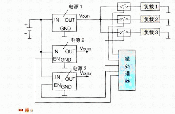 在實(shí)際應(yīng)用中,往往由于電路復(fù)雜而采用電源管理IC及多個(gè)負(fù)載開關(guān)組成的負(fù)載管理系統(tǒng),如圖6所示。圖6中有3個(gè)電源,輸出不同的電壓。電源1給負(fù)載1~3供電。為了控制負(fù)載1~3的通電或失電,在電源與負(fù)載之間設(shè)了3個(gè)負(fù)載開關(guān)。電源2、電源3則由電源管理IC來(lái)控制其負(fù)載的通電或失電。