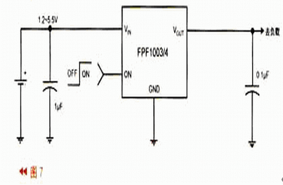 該器件典型應(yīng)用電路如圖7所示,輸入電容一般為1μF,輸出電容為0.1μF(都采用多層陶瓷電容器)。如在ON端加邏輯高電平時(shí),開關(guān)導(dǎo)通(VIN=1.2V時(shí),VIH≥0.8V;VIN=2.7~5.5V時(shí),VIH≥2V);ON端加邏輯低電平時(shí),開關(guān)關(guān)斷(VIN=1.2V時(shí),VIL≤0.35V;VIN=2.7V~5.5V時(shí),VIL≤0.8V)。RDS(on)與VIN有關(guān):VIN=5.5V時(shí),RDS(on)≤30MΩ;VIN=1.2V時(shí),RDS(on)≤150MΩ。
