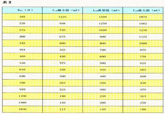 限制電流ILIM的設(shè)定與RSET有關(guān),其關(guān)系式為:RSET=275.6/ILIM。式中RSET的單位為歐姆,ILIM的單位為安培。設(shè)定的限制電流有一定的允差,如表2所示。