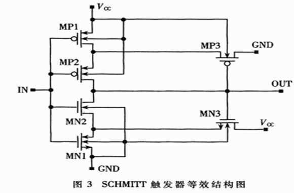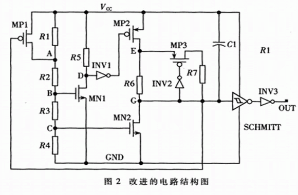 改進(jìn)的電路如圖2所示,電路結(jié)構(gòu)由采樣、先導(dǎo)控制、比較器、遲滯反饋回路、加速響應(yīng)電路、緩沖器六部分構(gòu)成。電阻R1、R2、R3、R4構(gòu)成分壓電阻網(wǎng)絡(luò)實(shí)現(xiàn)對Vcc的采樣;MNl、R5、INVl組成先導(dǎo)控制電路,實(shí)現(xiàn)對比較器灌電流的控制;MN2、R6、MP2組成比較器,實(shí)現(xiàn)采樣電壓與MN2的VTH比較;MP1構(gòu)成正反饋回路,可實(shí)現(xiàn)Vcc的遲滯功能;INV2、MP3、R7構(gòu)成正反饋回路,可加速比較器的翻轉(zhuǎn),從而提高電路的響應(yīng)速度;SCHMITT觸發(fā)器和INV3是緩沖電路,對比較器的輸出波形進(jìn)行緩沖和整形,SCHMITT觸發(fā)器的結(jié)構(gòu)如圖3所示,其工作原理詳見參考文獻(xiàn)[3];另外,電容C1起濾波和儲(chǔ)能作用。