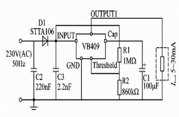 由于沒有變壓器,因此就失去了電流的絕緣,所以采用VB409作為供電電源,要用在對電流絕緣沒有要求的場合,例如洗衣機、中央供熱、功率計量等。對于需要電流絕緣的場合,需在供電輸入端加一個1∶1的小型隔離變壓器,因為輸入功率低,所以變壓器的尺寸可以做得比較小,同時變壓器的輸出還可以使用電阻分壓后再輸入到VB409中。