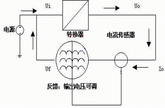 在能量反饋部分就要能實(shí)現(xiàn)上述要求,保證穩(wěn)定的電能轉(zhuǎn)換器的輸出電流,采用電流傳感器檢測(cè)電能轉(zhuǎn)換器的輸出電流,同時(shí)反饋部分采用反饋電壓與輸出控制電流之間成反比系數(shù)關(guān)系即Uf∝K/Io,為便于分析,設(shè)電源電壓Ui為穩(wěn)定值。當(dāng)輸出電流較小時(shí),通過(guò)調(diào)節(jié)反饋電壓,使其變大,則反饋電壓與輸入的電壓差△U=Uf-Ui變大, 相應(yīng)的由反饋電壓流向輸入電壓的電流加大,造成相應(yīng)的反饋功率加大;當(dāng)輸出電流較大時(shí),通過(guò)調(diào)節(jié)反饋電壓,使Uf變小,則反饋電壓與輸入的電壓差△U變小,相應(yīng)的由反饋電壓流向輸入電壓的電流減小,造成循環(huán)的功率減?。徽麄€(gè)過(guò)程維持負(fù)反饋控制,最終達(dá)到動(dòng)態(tài)平衡,維持設(shè)定的額定功率。