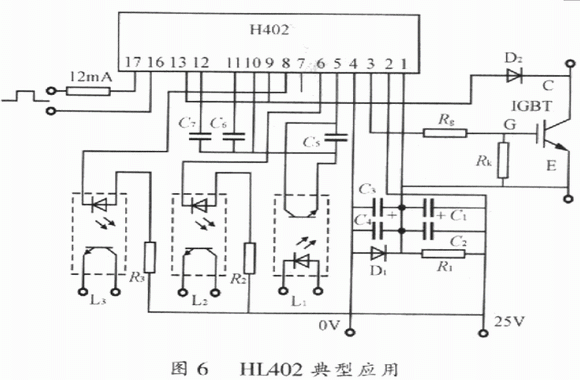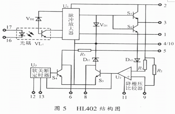 HL402是17腳單列直插式結(jié)構(gòu),內(nèi)置有靜電屏蔽層的高速光耦合器實現(xiàn)信號隔離,抗干擾能力強(qiáng),響應(yīng)速度快,隔離電壓高。它具有對IGBT進(jìn)行降柵壓、軟關(guān)斷雙重保護(hù)功能,在軟關(guān)斷及降柵壓的同時能輸出報警信號,實現(xiàn)封鎖脈沖或分?jǐn)嘀骰芈返谋Wo(hù)。它輸出驅(qū)動電壓幅值高,正向驅(qū)動電壓可達(dá)15~17V,負(fù)向偏置電壓可達(dá)10~12V,因而可用來直接驅(qū)動容量為400A/600V及300A/1200V以下的IGBT。