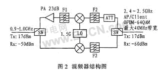 高性能的本振信號是影響混頻器輸出頻譜純度的主要因素。利用鎖相環(huán)頻率合成技術設計的本振源能為混頻電路提供性能良好的本振載波。在WLAN中,混頻器需將來自AP的2.4 GHz的信號下變換到950 MHz,以使信號能在特定的電纜上傳輸?;祛l器結構圖如圖2所示。ADF4360-4產生1.5 GHz的本地振蕩器(LO),混頻器采用AD8343,F(xiàn)1為900 MHz~1000 MHz的帶通濾波器。F2為24 GHz~2.5 GHz的帶通濾波器。PA的信號功率較大,超過AD8343門限,必須衰減,ATT為衰減網絡。