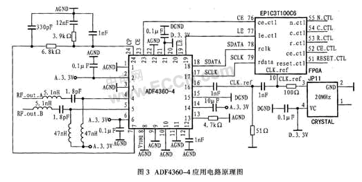圖3是利用ADF460-4作為混頻器本振的外圍電路。外部晶體振蕩器為20 MHz,具有高穩(wěn)定性。該晶體振蕩器不僅為ADF4360-4提供參考頻率,還為控制ADF4360-4的FPGA器件提供時鐘。晶體振蕩器接ADF4360-4的參考時鐘輸入引腳CLK_ref,在內部電荷泵輸出引腳CP和VCO輸出引腳VTUNE之間接入環(huán)路濾波電路。