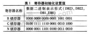 主分頻比N=1.5 GHz/200 kHz=7 500 。需要注意的是:雙模前置分頻器(P/P+1)輸出頻率要求小于300 MHz。因此選擇P/P+1=16/17,根據N=BF+A(A、B為整數(shù)),得到A=12,B=468。3個24位鎖存器的初始化設置如表1所示。
