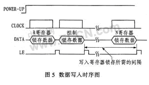 數(shù)據寫入時序:DATA在每個CLOCK的上升沿從MSB(最高有效位)開始依次寫入24位移位寄存器中的數(shù)據并一次鎖存到目標寄存器,再開始下一個目標寄存器的初始化。目標寄存器選取由移位寄存器中的DB1、DB0決定。對寄存器賦值順序為R,C、N。C寄存器和N寄存器賦值間隔應大于5 ms,數(shù)據寫入時序如圖5所示。