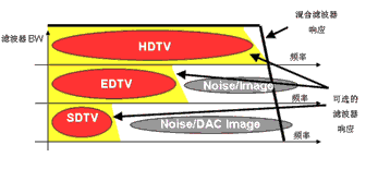 ED 480p/576p信號(hào)也可能出現(xiàn)這種情況。此類信號(hào)通常采樣頻率為54MHz,視頻帶寬為 12MHz。因此,第二Nyquist區(qū)圖像會(huì)在42MHz時(shí)出現(xiàn)。如果無源濾波器為35MHz或更高,那么圖像的衰減也會(huì)很小,同樣也會(huì)導(dǎo)致畫質(zhì)非常差。