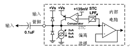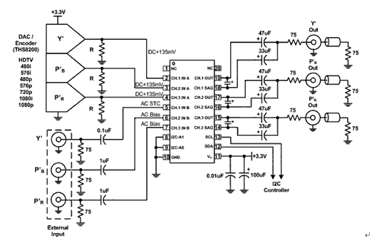 如果DAC的參考電壓為3.3V或1.8V或者是外部輸入,那么采用AC耦合就是最佳模式。AC耦合使THS73x3能忽略DC偏置點(diǎn)的來源,并能重新建立自己的DC偏置點(diǎn)。AC耦合選項(xiàng)包括AC偏置和AC同步端鉗位。