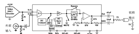 如果系統(tǒng)設(shè)計(jì)中已經(jīng)采用了THS7303或THS7313 6dB增益放大器,并采用了參考接地的DAC或編碼器驅(qū)動(dòng),那么DC輸入模式會(huì)很理想。問題在于,DAC生成的電壓有多低?如果同步信號(hào)(通常這是視頻信號(hào)中電壓最低的)電壓低于50mV,那么6dB放大器的輸出就應(yīng)生成低于100mV的電壓,由于CMOS和雙極放大器都存在晶體管飽和方面的限制,因此這對(duì)任何放大器來說都是很難做到的。
