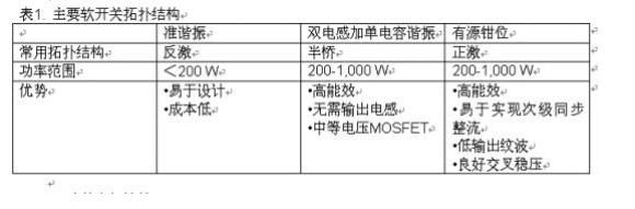 要提高主轉(zhuǎn)換器能效可以采用以下幾種方法。一是通過降低導(dǎo)通阻抗(開關(guān)損耗較高)和/或減小初級峰值電流和均方根電流來降低初級導(dǎo)通損耗;二是考慮采用軟開關(guān)技術(shù)降低開關(guān)損耗;三是通過減少整流器壓降(使用低正向壓降二極管或FET整流器)來降低次級損耗;四是采用更好的磁芯材料來降低磁芯損耗。表1列出了主要軟開關(guān)的拓撲結(jié)構(gòu),可供設(shè)計時參考。