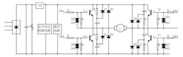 電機(jī)停車(chē)或減速時(shí)工作在制動(dòng)狀態(tài),儲(chǔ)存在電機(jī)和負(fù)載運(yùn)動(dòng)部分的動(dòng)能將變成電能,并通過(guò)PWM 變換器回饋給直流電源。系統(tǒng)有不可控的整流器供電,不能向電網(wǎng)回饋電能,只好對(duì)電容器C 充電而使泵升電壓升高,過(guò)高的泵升電壓有可能擊穿變換元件。泵升電壓檢測(cè)電路如圖3。