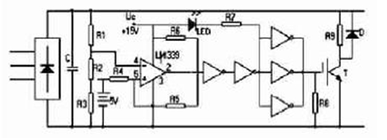 設(shè)UDC為電力電容C1 兩端的電壓,電壓比較電路直接檢測(cè)該電壓,與被測(cè)值超過(guò)設(shè)定允許值時(shí),電壓比較器反轉(zhuǎn), 觸發(fā)制動(dòng)單元VB 導(dǎo)通,電力電容上的電荷經(jīng)R 釋放,使電壓降低,反之,當(dāng)該電壓低于設(shè)定允許值時(shí),電壓比較器翻轉(zhuǎn)回原先狀態(tài),輸出端為高電壓,經(jīng)邏輯轉(zhuǎn)換后關(guān)斷UB 。由于比較器為OC 門(mén)輸出,該端電壓近乎電源電壓UC。