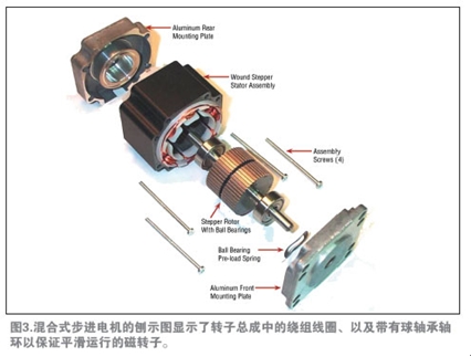 混合式步進(jìn)電機(jī)結(jié)合了永磁和開關(guān)磁阻電機(jī)的工作原理,在轉(zhuǎn)子軸上裝有一對或多對外圓周有很多齒的定子疊片,在每對定子疊片間有一個永磁體,會在軸向上生成北極和南極。齒的數(shù)量、電機(jī)結(jié)構(gòu)與驅(qū)動方案等幾項因素確定了電機(jī)的步進(jìn)角度,多數(shù)應(yīng)用指定了混合式步進(jìn)電機(jī)1.8°的步長(每轉(zhuǎn)200步長)(見參考資料)。