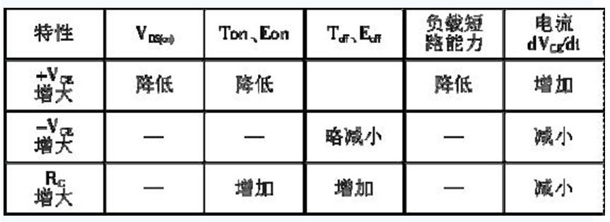 IGBT 的驅動條件與它的靜態(tài)和動態(tài)特性密切相關。柵極的正偏壓+VGE、負偏壓-VGE 和柵極電阻RG 的大小,對IGBT 的通態(tài)電壓、開關時間、開關損耗、承受短路能力以及dVCE/dt等參數(shù)都有不同程度的影響。門極驅動條件與器件特性的關系如表1 所示。