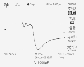 1、當(dāng)測(cè)試電容為(AL)液體鋁電解電容器CT=1000μF ESR=56mΩ時(shí),輸出電壓下跌值為232mV。