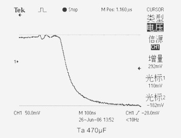 2、當(dāng)測(cè)試電容為(Ta)鉭電解電容器CT=470μF ESR=149mΩ時(shí),輸出電壓下跌值為292mV。