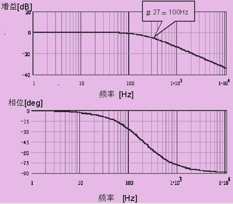 速度反饋濾波器也為一階延遲濾波器,這是一個(gè)純粹的慣性環(huán)節(jié),相移趨于90°。在高頻時(shí)增益小,當(dāng)高頻處有幾個(gè)諧振點(diǎn)時(shí)適用。增益在-3db規(guī)定為帶寬頻率,設(shè)置范圍從50~1000hz(見(jiàn)圖3)。注意使用時(shí)相移可到90°,可能會(huì)發(fā)生相移引起的振蕩。