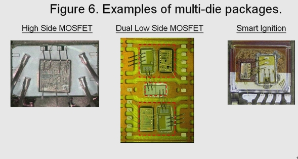 圖6所示為目前車載系統(tǒng)中采用多芯片封裝的幾個實例。這些智能化器件可以提供更高的系統(tǒng)性能監(jiān)控能力,通過集成保護功能提高功率系統(tǒng)的可靠性。如過流、過壓和過熱保護等功能都是這類產(chǎn)品的標配。當器件感測到有可能發(fā)生上述異常狀況時,能夠把功率MOSFET置于自我保護整個系統(tǒng)的環(huán)境中。此外,這些器件還集成有附加診斷功能,用以監(jiān)控負載開路或短路,有助于指導(dǎo)汽車機械裝置隔離和糾正車輛中出現(xiàn)的問題。