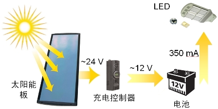 圖1:典型的太陽能供電街道照明系統(tǒng)示意圖。