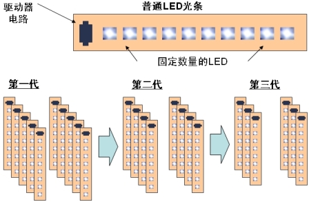 首先,在模塊化途徑替代金鹵燈光源方面,可使每個LED光條采用固定數(shù)量的LED。隨著LED在光輸出等方面性能的持續(xù)提升,要提供相同的總光能輸出,就可以使用更少的LED光條,從而降低需要使用的LED的成本,參見圖3。