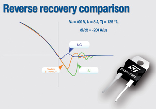 像STPSC806D和STPS1006D 這類碳化硅二極管給開關(guān)式電源(SMPS)設(shè)計(jì)人員帶來的另一個(gè)好處是,可以提高開關(guān)頻率,使其它元器件如濾波電容和電感變得更小,成本更低廉,功耗更低。
