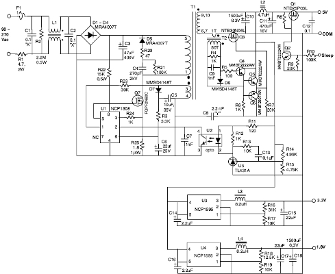 本文介紹的參考設(shè)計采用通用交流輸入,提供5.0 V、3.3 V和1.8 V輸出,能效高于72%。只要簡單改變3.3 V和1.8 V輸出上的檢測網(wǎng)絡,也可以提供其它輸出電壓。如果需要“休眠模式”的話,該設(shè)計也提供抑制5 V輸出的選項。此電源的主轉(zhuǎn)換器使用安森美半導體的NCP1308電流模式控制器及1個外部MOSFET,采用準諧振(QR)反激拓撲結(jié)構(gòu)設(shè)計。5 V輸出采用1個同步整流MOSFET,而2個較低電壓輸出轉(zhuǎn)換器采用工作在1 MHz頻率的NCP1595單片同步降壓穩(wěn)壓器來實現(xiàn)。5 V輸出還充當2個降壓穩(wěn)壓器的直流源。這種特別的元件組合提供了一種簡單但有效的三輸出開關(guān)穩(wěn)壓器,根據(jù)輸出電壓和電流組合及相應系統(tǒng)總能效的不同,提供近6 W的有效功率輸出。此設(shè)計除了具有輸入傳導EMI濾波器,還增加了過流保護(OCP)和過壓保護(OVP)等典型保護功能。