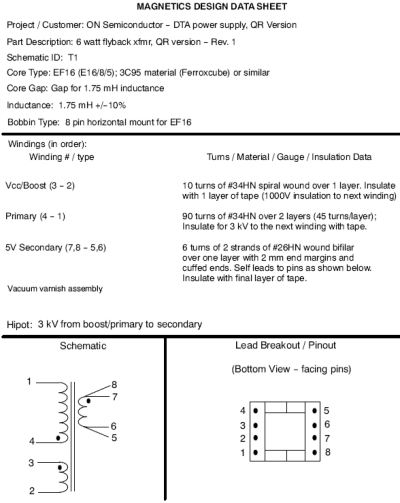 電流感測變壓器T2的設(shè)計并非最關(guān)鍵的事項,可以采用任何匝數(shù)比在30:1至50:1的小型鐵芯就可以使用。然而,主反激變壓器T1的設(shè)計對能效及優(yōu)化電源性能而言非常關(guān)鍵。我們并不建議重新設(shè)計磁芯結(jié)構(gòu)更小(磁芯橫截面積Ae更小)的變壓器。使用橫截面積較大的磁芯可能使總匝數(shù)較少,并有可能增量提升能效,但為了恰當?shù)碾娐饭ぷ鳎枰S持規(guī)定的電感值。