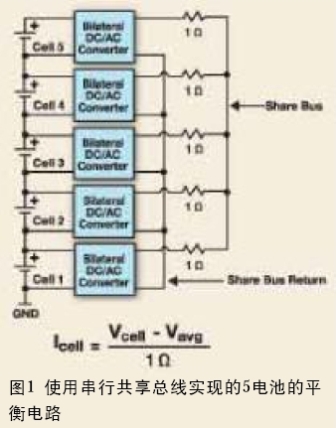 改善這種狀況的方法被稱為平衡。平衡是強(qiáng)制所有電池具有相同電壓的過(guò)程。這是通過(guò)平衡電路實(shí)現(xiàn)的。Aeroflex 平衡電路使用共享總線,這個(gè)總線的電壓等于所有電池的平均電壓。平衡電路由那些超過(guò)共享總線電壓的電池充電并將電能注入到電壓較低的電池,這個(gè)工作是通過(guò)高效率的雙邊DC/AC轉(zhuǎn)換器來(lái)完成的。平衡電流的大小與電壓差成正比,也就是說(shuō),隨著電池越來(lái)越接近理想平衡狀態(tài),平衡電流將趨近于0。圖1顯示了一個(gè)用于5個(gè)電池的平衡電路,其中,1 Ω電阻確定了傳輸比,也就是不平衡電壓與平衡電流的比值。對(duì)于容量較大(通常20Ah或更高)的電池而言,為了將達(dá)到平衡的時(shí)間減到最短,需要高達(dá)1A的平衡電流。對(duì)這些應(yīng)用而言,雙DC/AC轉(zhuǎn)換器電路通過(guò)平面變壓器工作在100kHz的頻率附近。