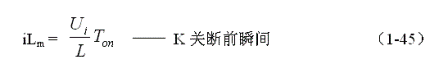 (1-44)式中iL為流過儲能電感L電流的瞬時值,t為時間變量;i(0)為的初始電流,即:控制開關(guān)K接通瞬間之前,流過儲能電感L中的電流。當(dāng)開關(guān)電源工作于臨界連續(xù)電流狀態(tài)時,i(0) = 0 ,由此可以求得流過儲能電感L的最大電流為:
